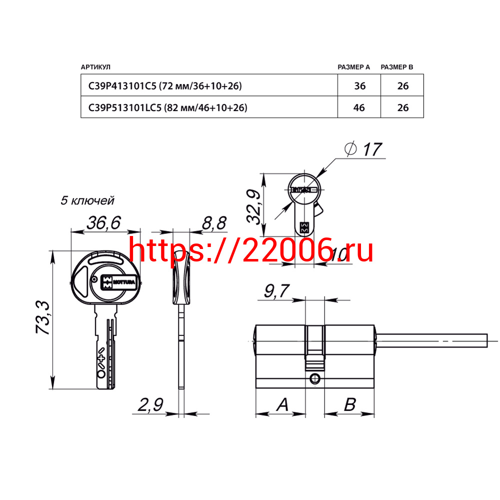 - Цилиндровый механизм Mottura (Моттура) под вертушку (дл. шток) C39P513101LC5 (82 мм/46+10+26), ЛАТУНЬ (PVD) в Сочи недорого