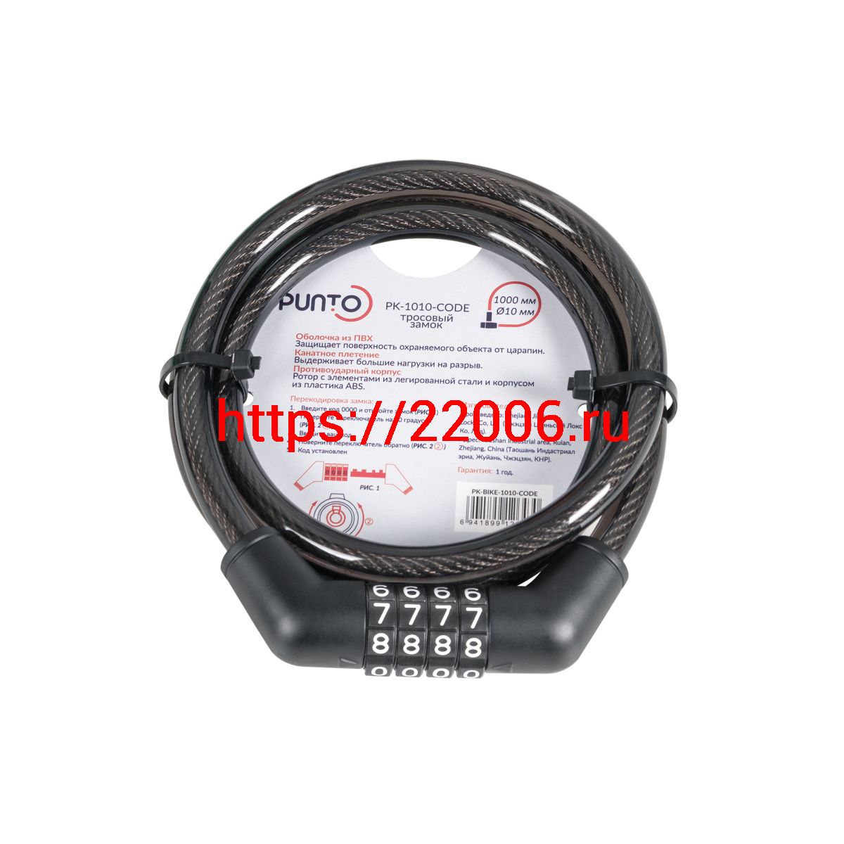- Замок Punto (Пунто) тросовый PK-BIKE-1010-CODE (10х1000) /подвес в Сочи недорого