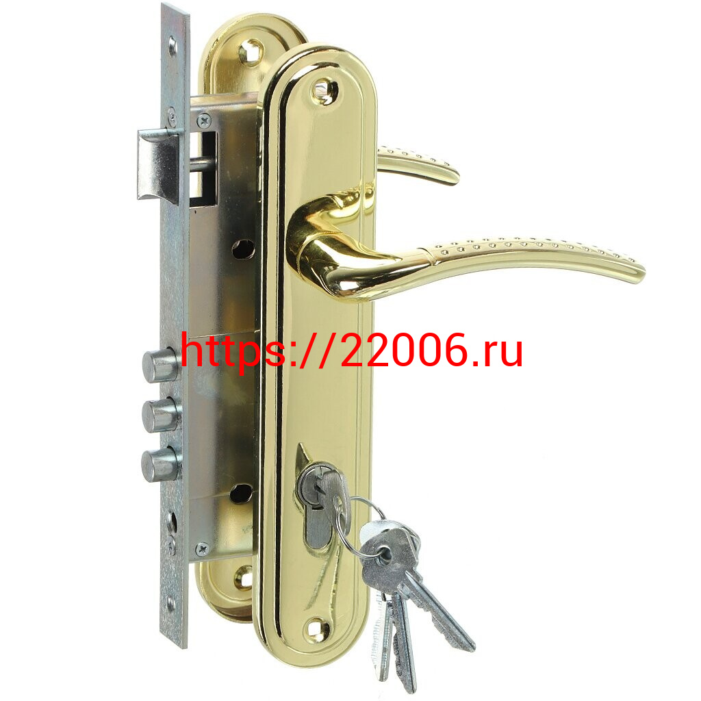 - Замок Omega (Омега) врезной цилиндровый с защёлкой в комплекте с ручкой ЗВ4-85.27 (золото-лак), 4 кл. в Сочи недорого