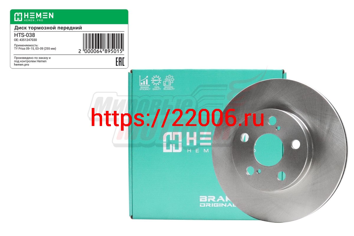 - Диск тормозной передний Toyota Prius 09-15, 03-09,диам. 255 мм (HTS038) в Сочи недорого